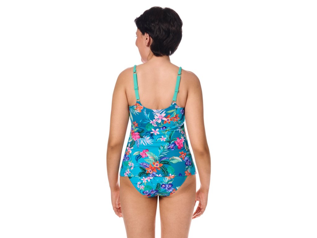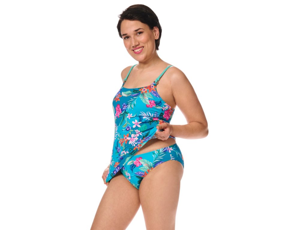 Plavkové tankini s botanickým vzorem plným exotických květin v tyrkysové barvě. Střih lehce do "A".